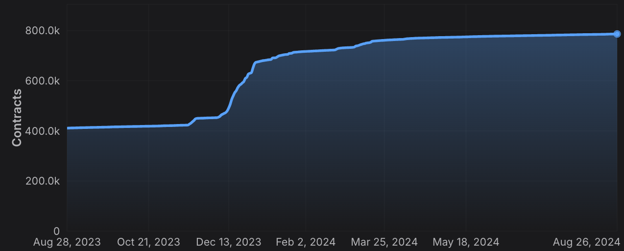 Monitor the cumulative number of smart contracts deployed, helping to gauge developer engagement and platform usage.