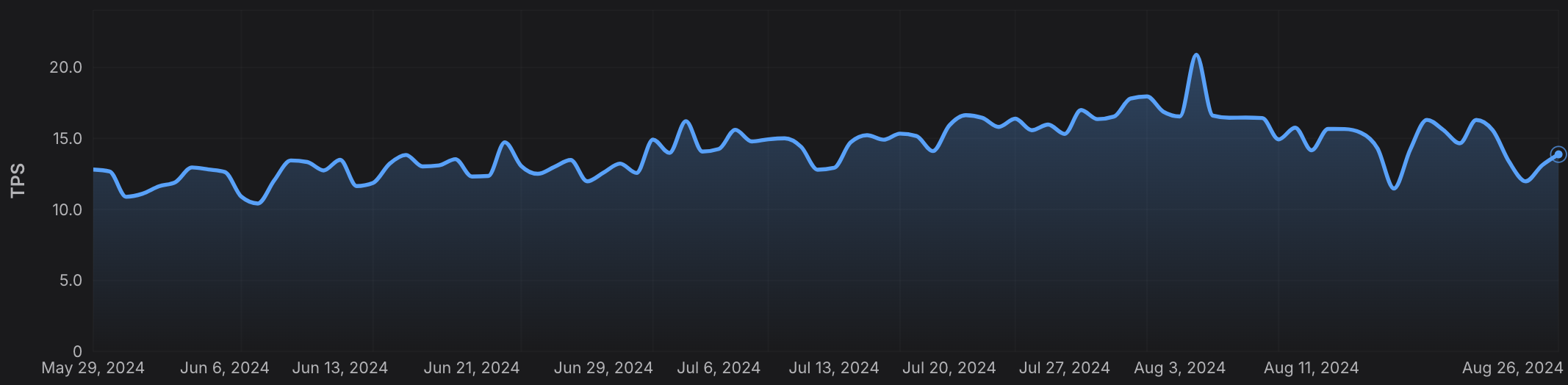 Analyze average and maximum gas prices over time to optimize transaction costs and predict fee trends. Monitor the average and peak TPS to assess the network’s capacity and utilization.
